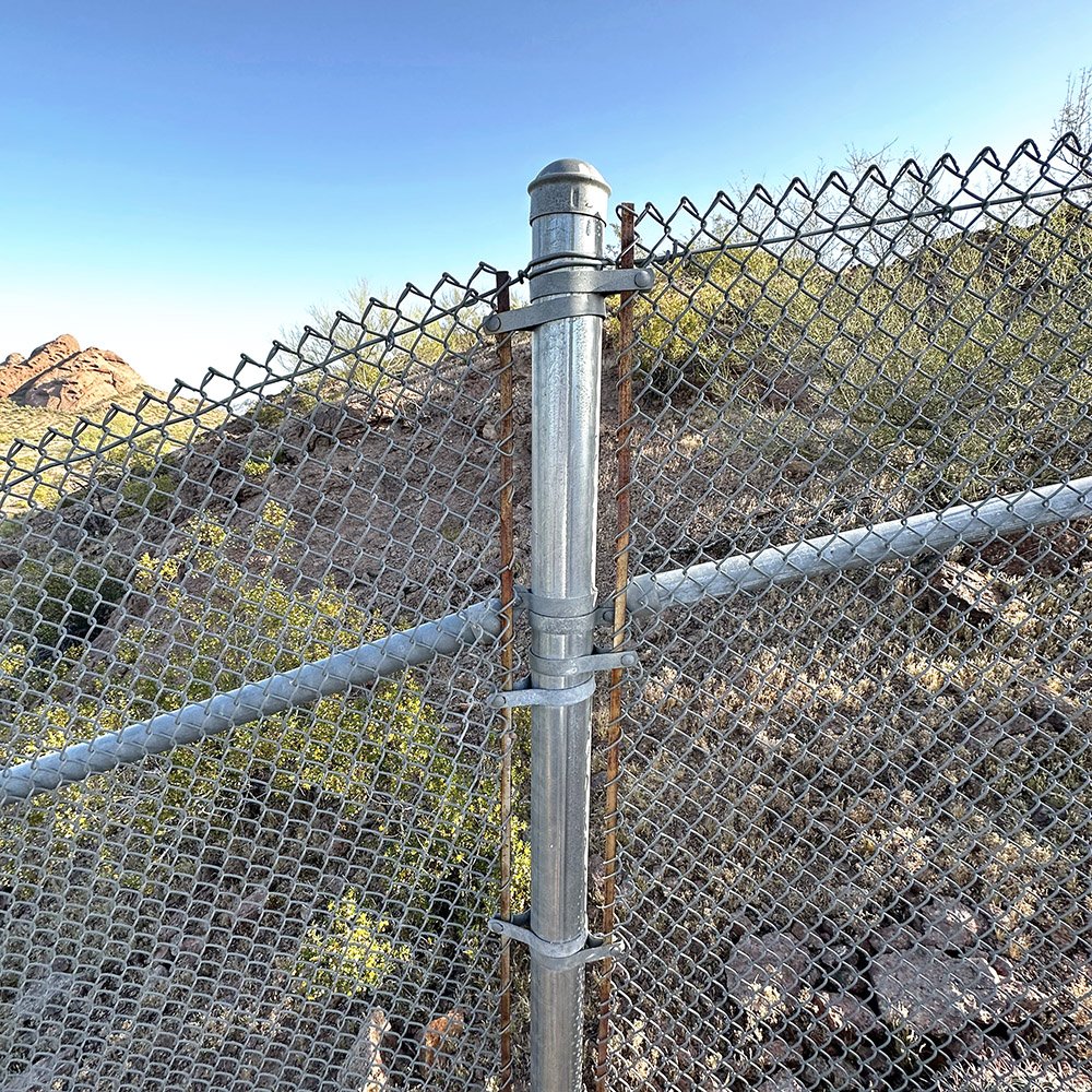 The line posts are the posts that fall between the terminal or end posts. Usually set 10 feet or less on center, they provide a solid point of attachment to tie the chain link fabric to and hold the top rail in place. Residential fencing projects typically have line post diameters of around 1 5/8 inches and 2 inches. Commercial and Industrial projects typically have a line post size of 2 inches, 2 3/8 inches, and occasionally 3 inches in diameter. The latter provides extra strength for taller projects.